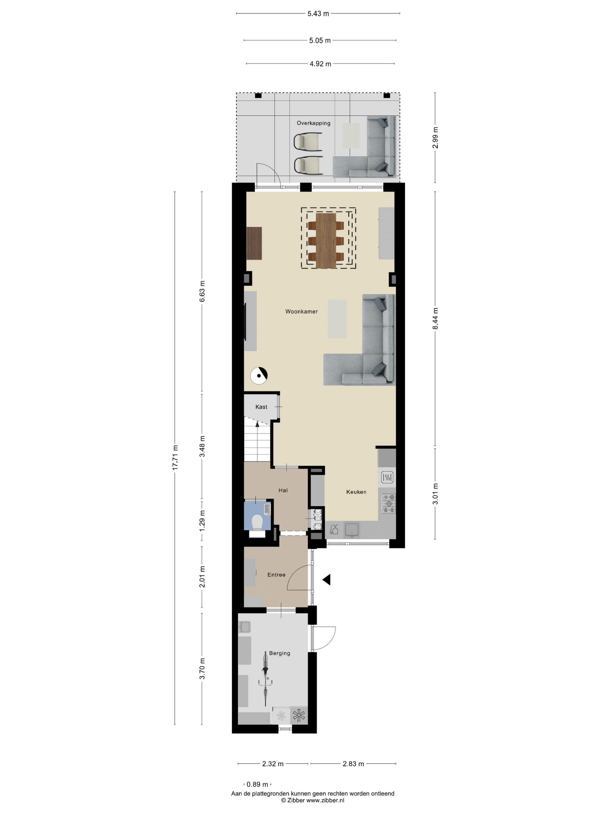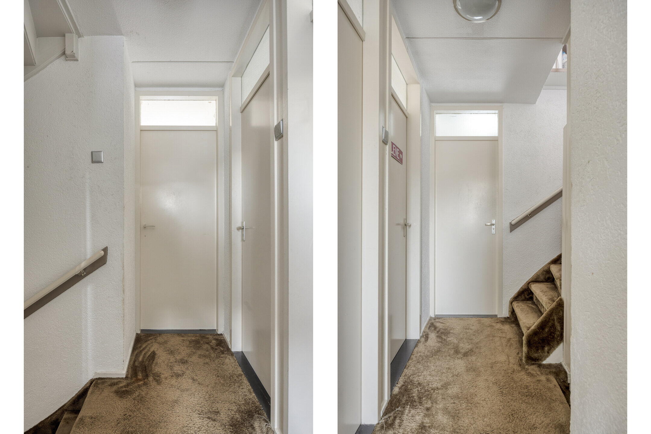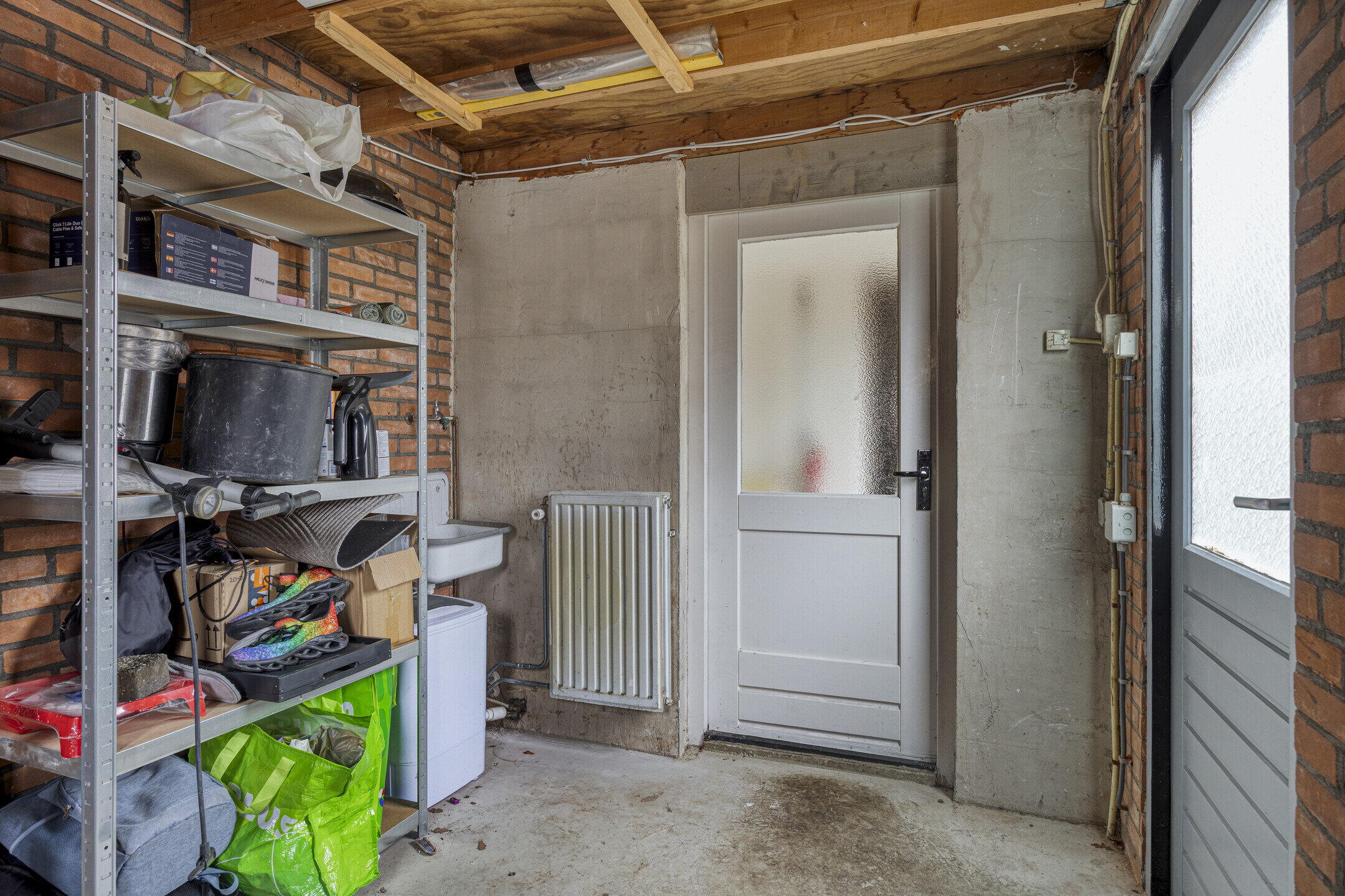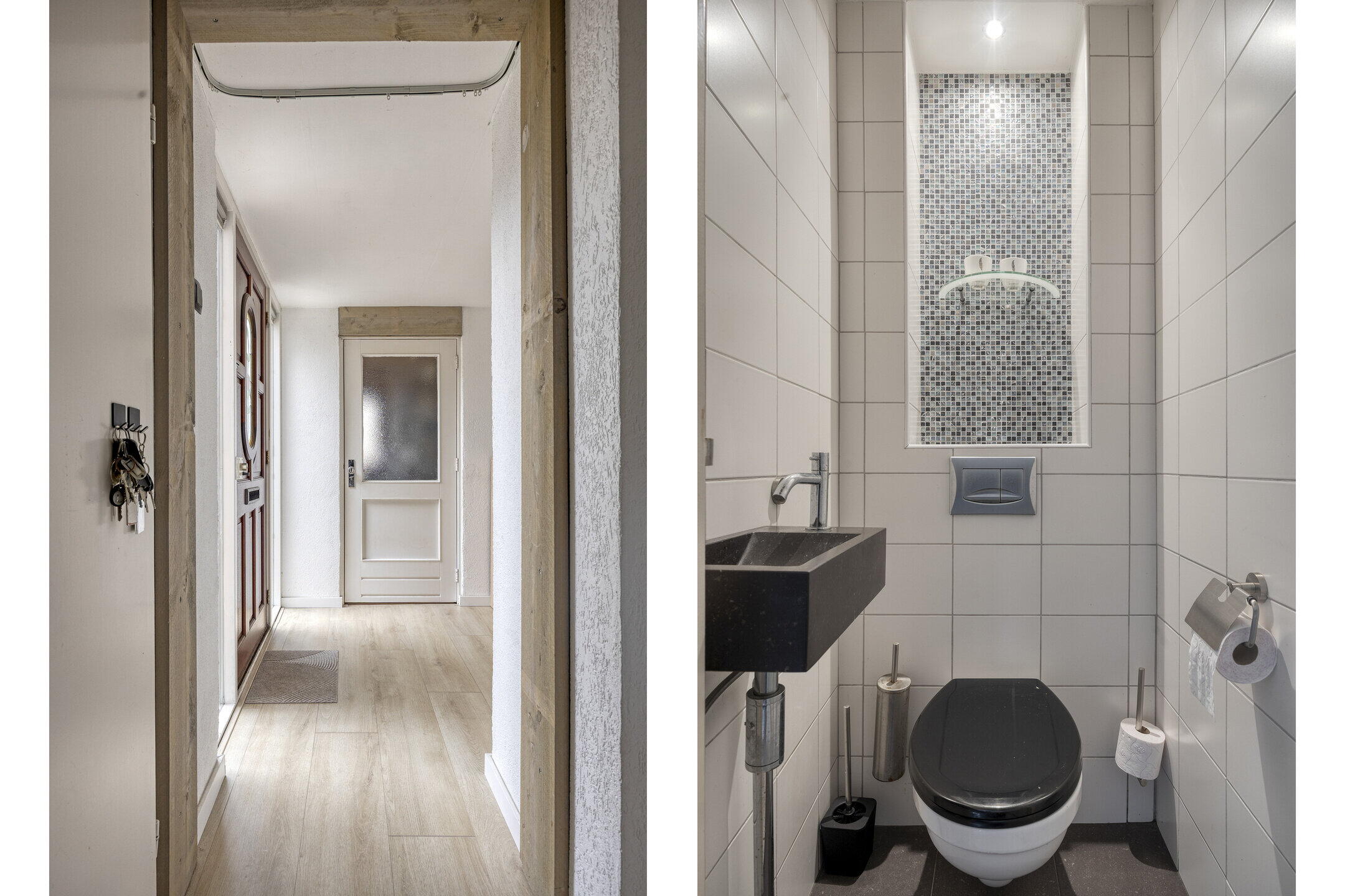 Je komt binnen in een ruime entree waar direct aan de linkerzijde een praktische berging te vinden is, ideaal voor bijvoorbeeld fietsen of extra opslag. Vanuit hier loop je door naar de hal met een apart toilet en de trapopgang naar de eerste verdieping. Een nette en functionele binnenkomst die meteen een goede eerste indruk geeft.
