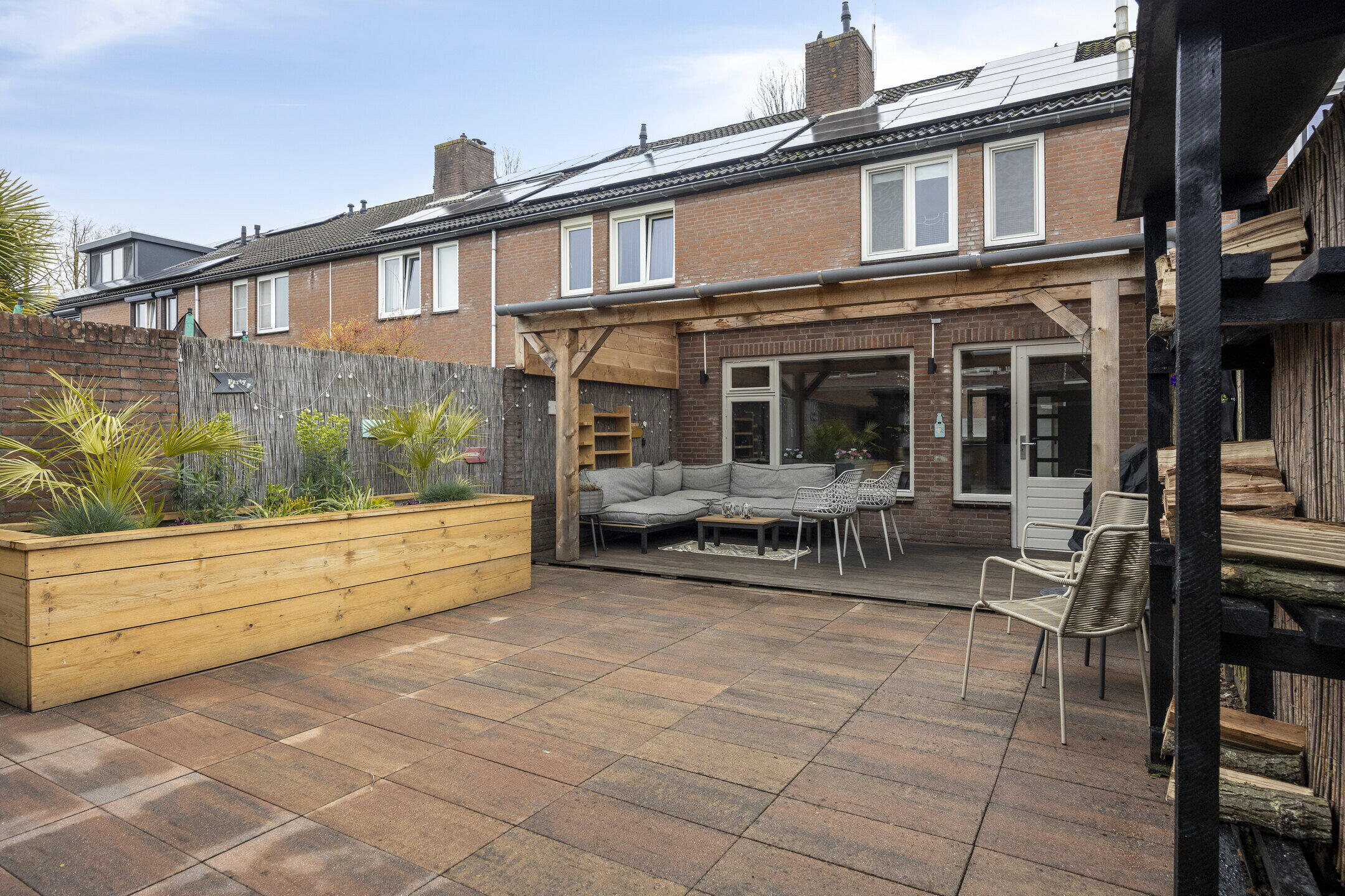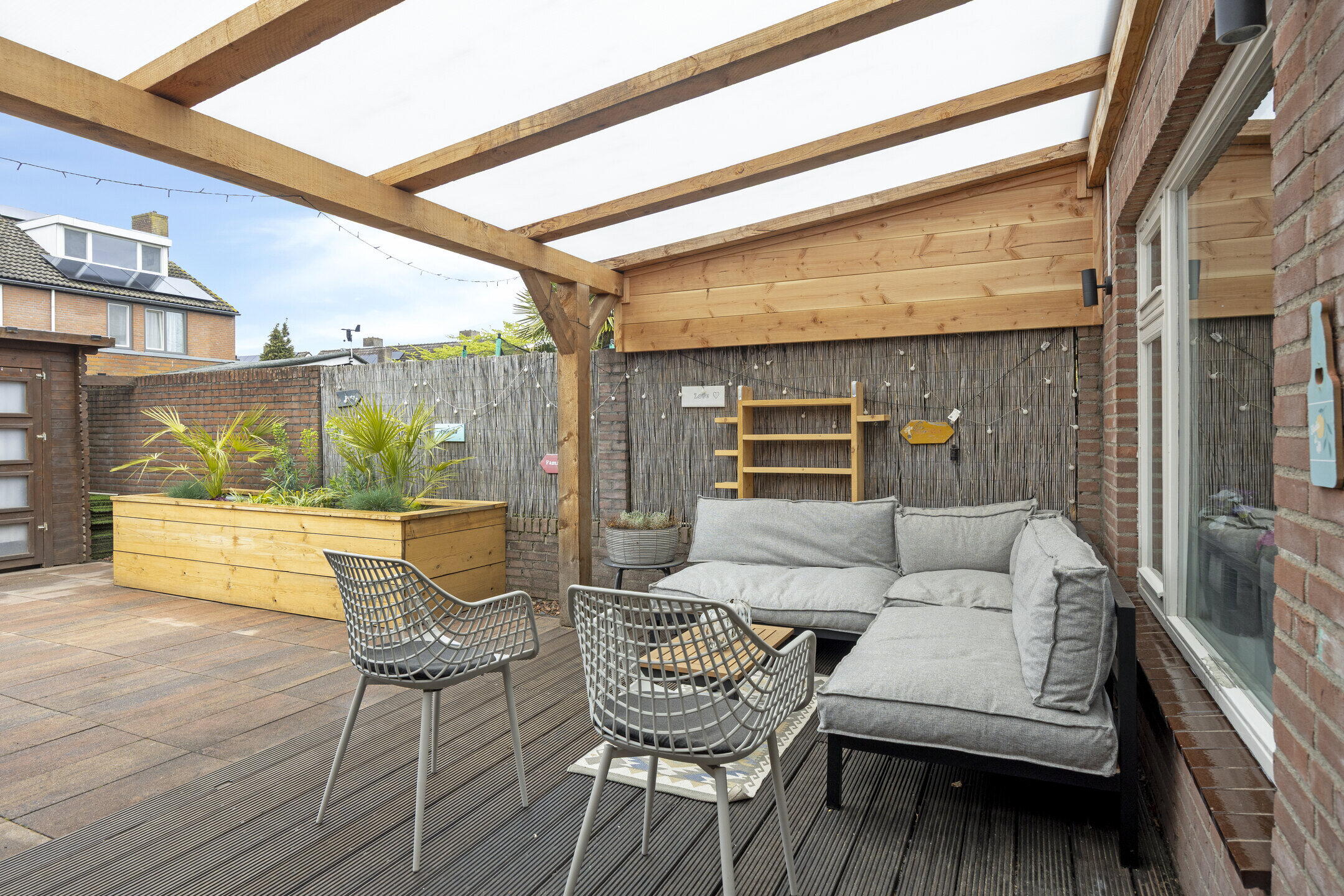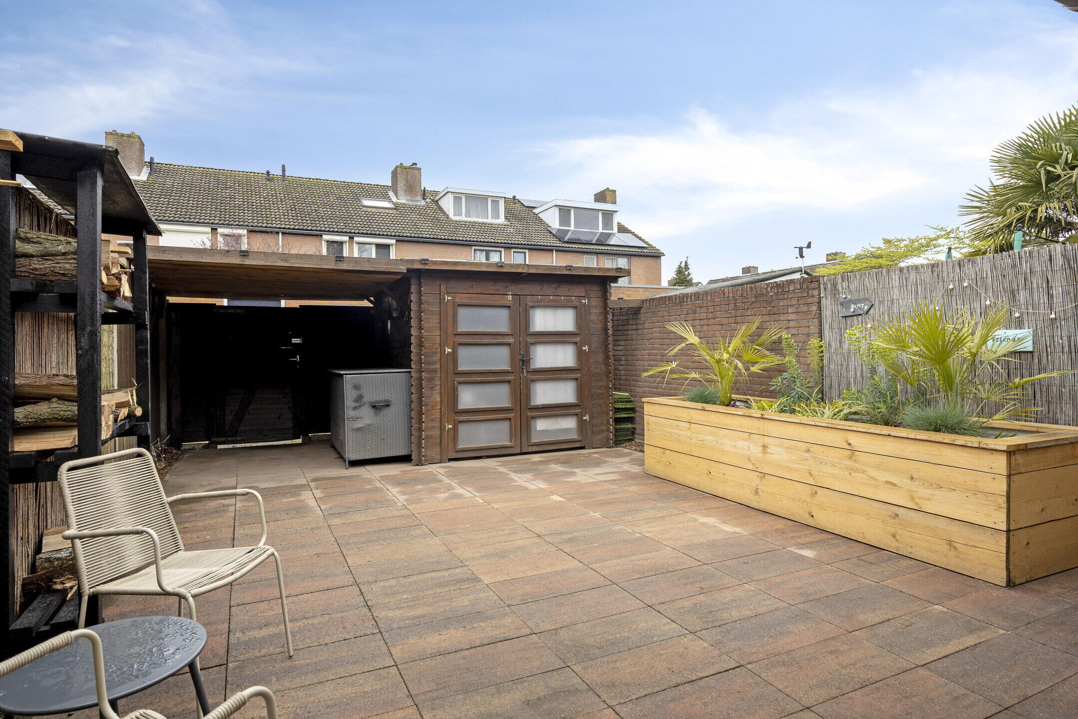 De achtertuin is onderhoudsvriendelijk en volledig bestraat, maar toch sfeervol ingericht. Onder de overkapping creëer je eenvoudig een fijne loungeplek waar je tot in de late uurtjes kunt genieten. Achterin de tuin vind je nog een houten berging en een praktische achterom, ideaal!