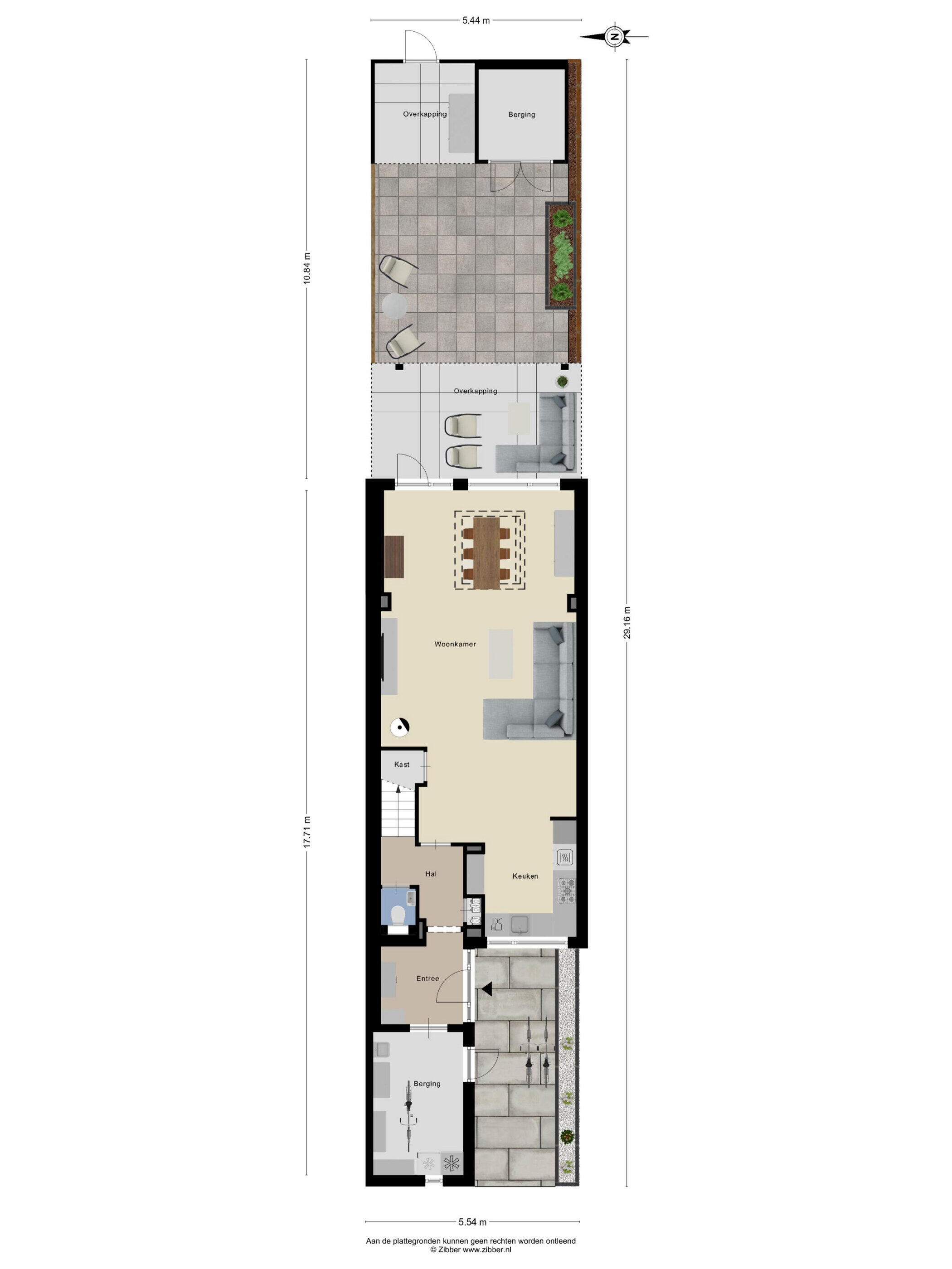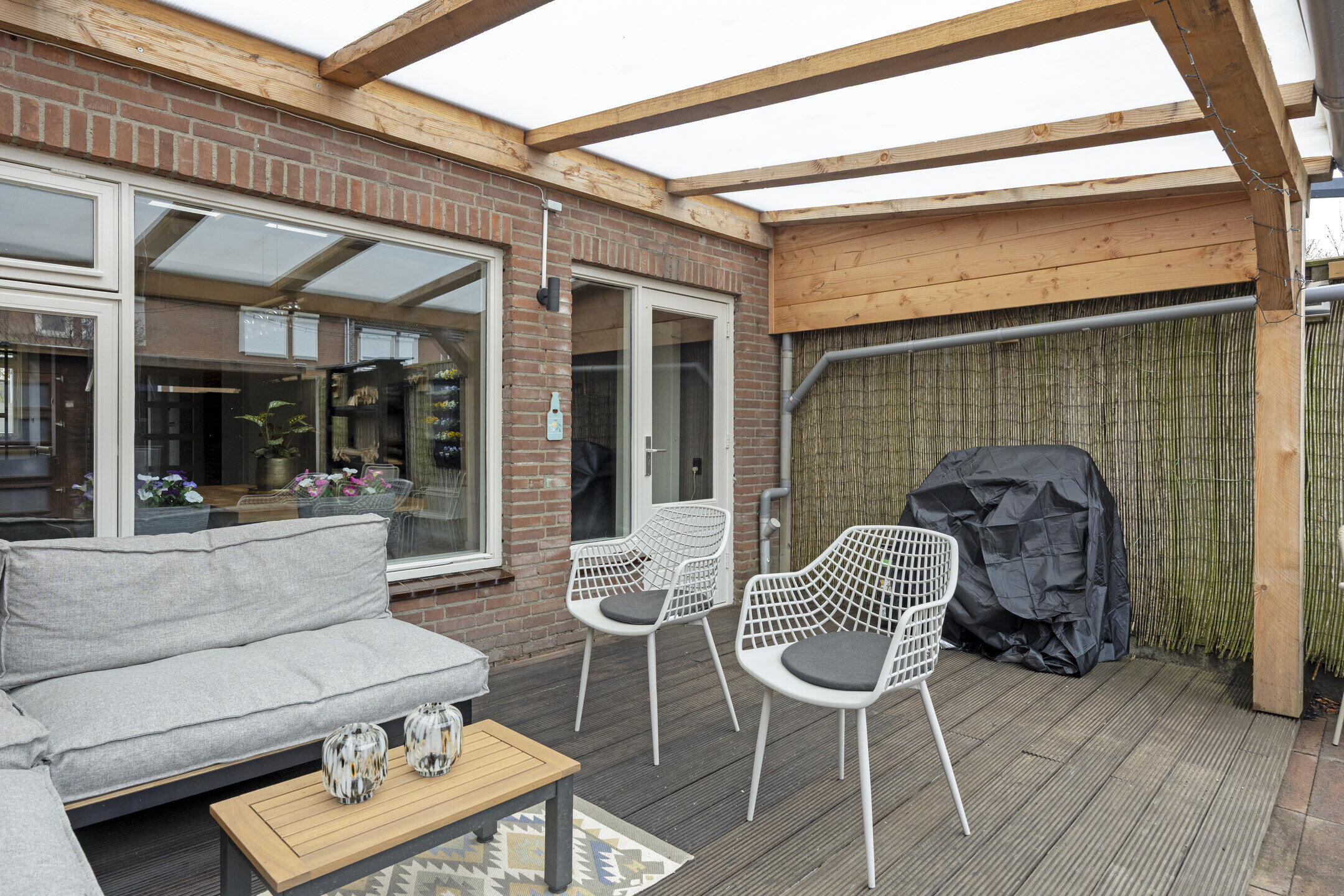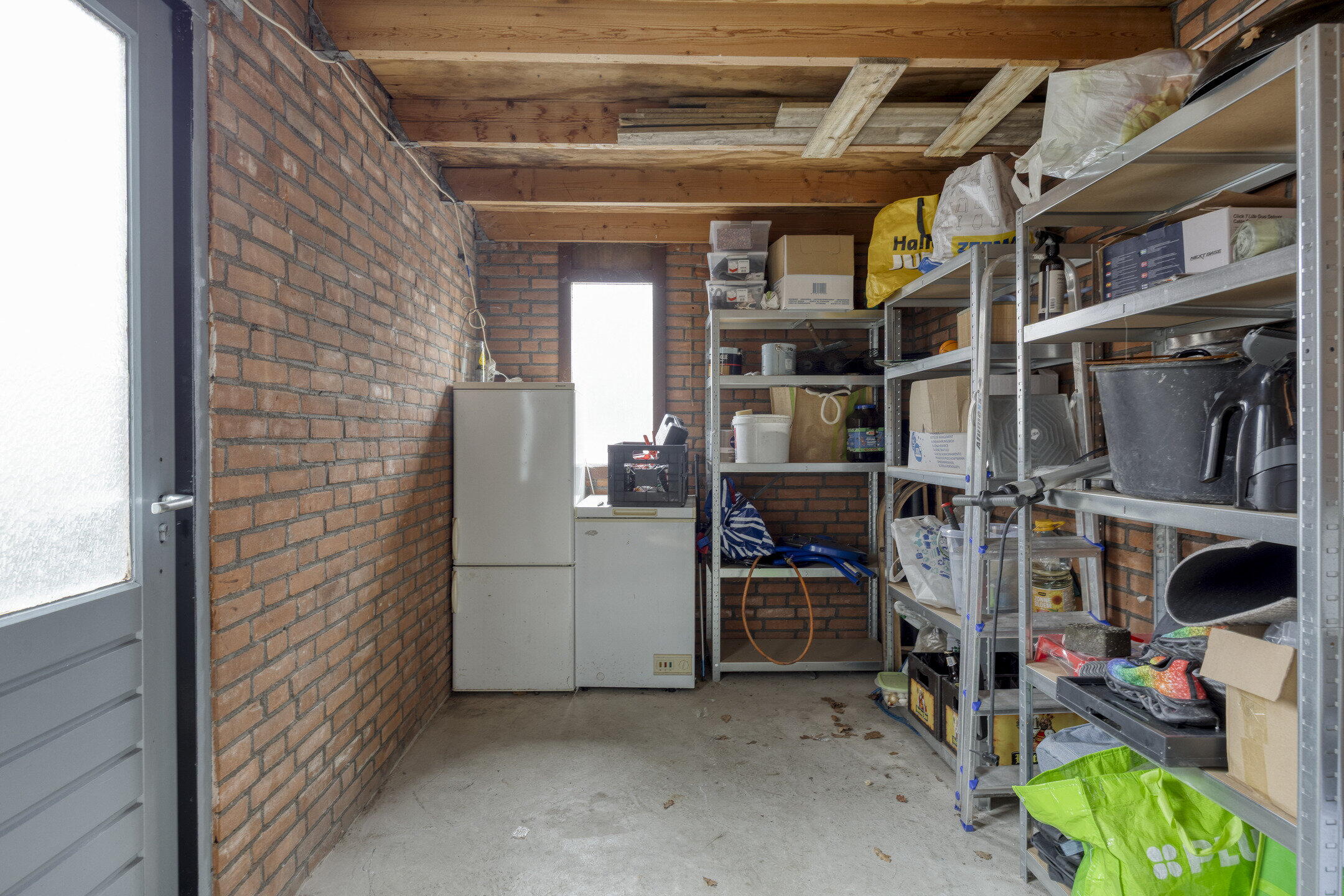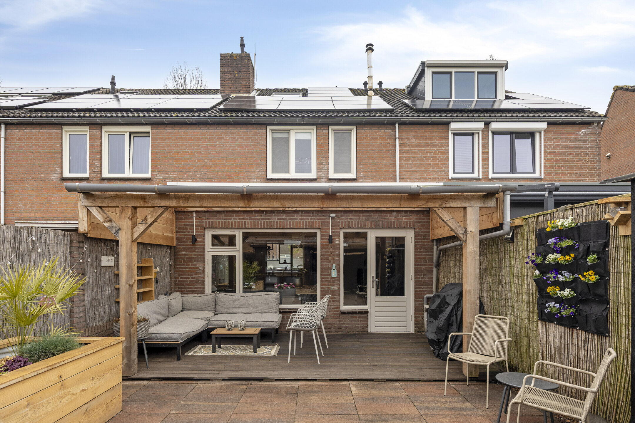 De achtertuin is onderhoudsvriendelijk en volledig bestraat, maar toch sfeervol ingericht. Onder de overkapping creëer je eenvoudig een fijne loungeplek waar je tot in de late uurtjes kunt genieten. Achterin de tuin vind je nog een houten berging en een praktische achterom, ideaal!