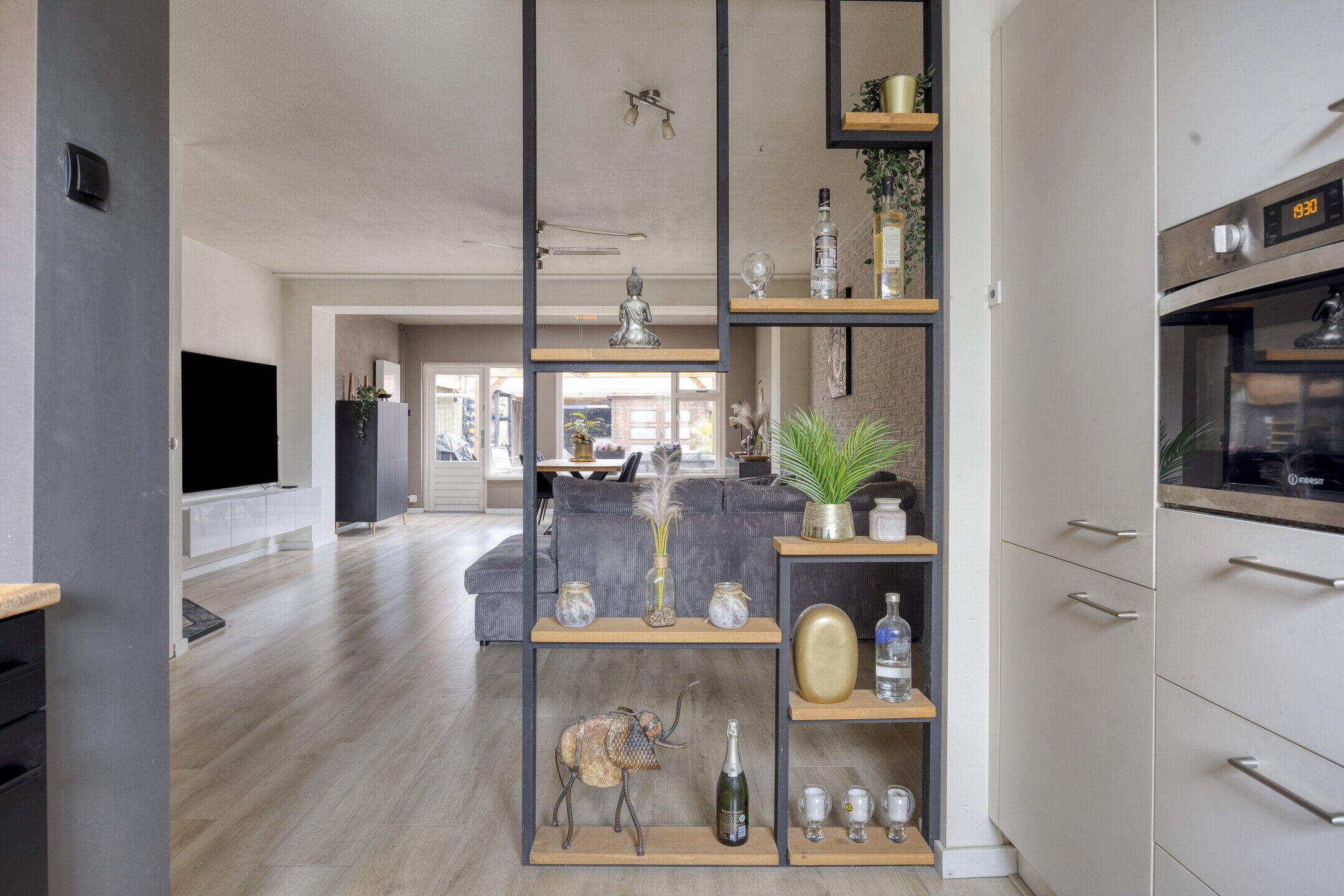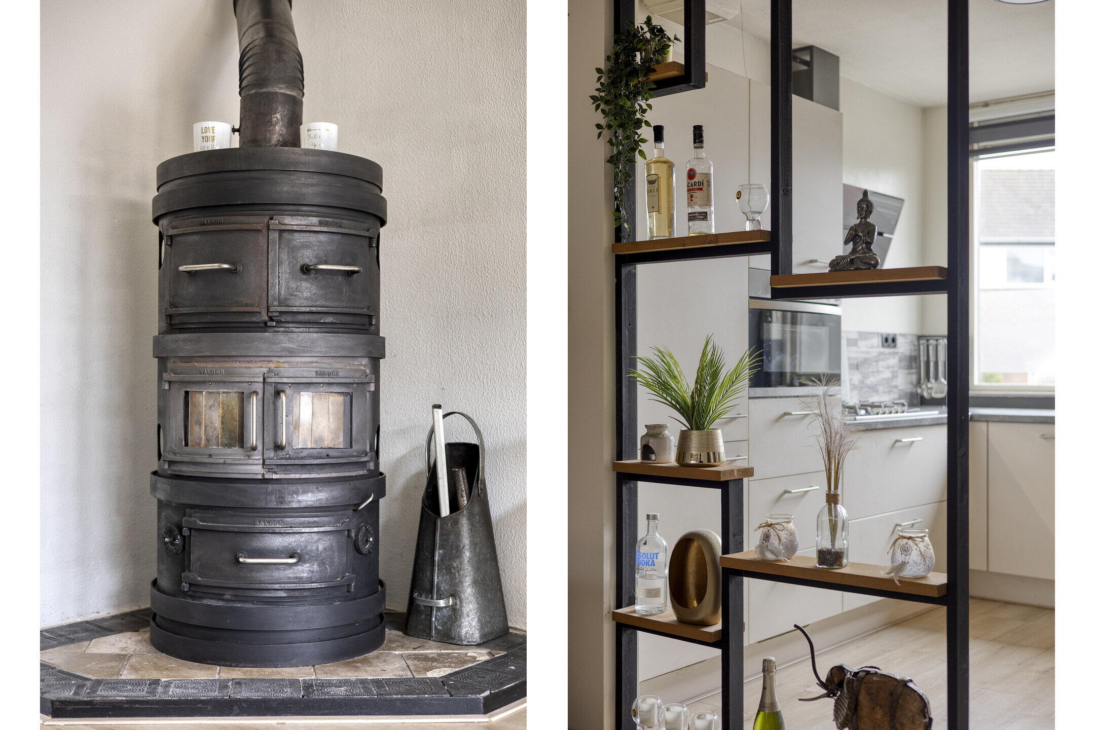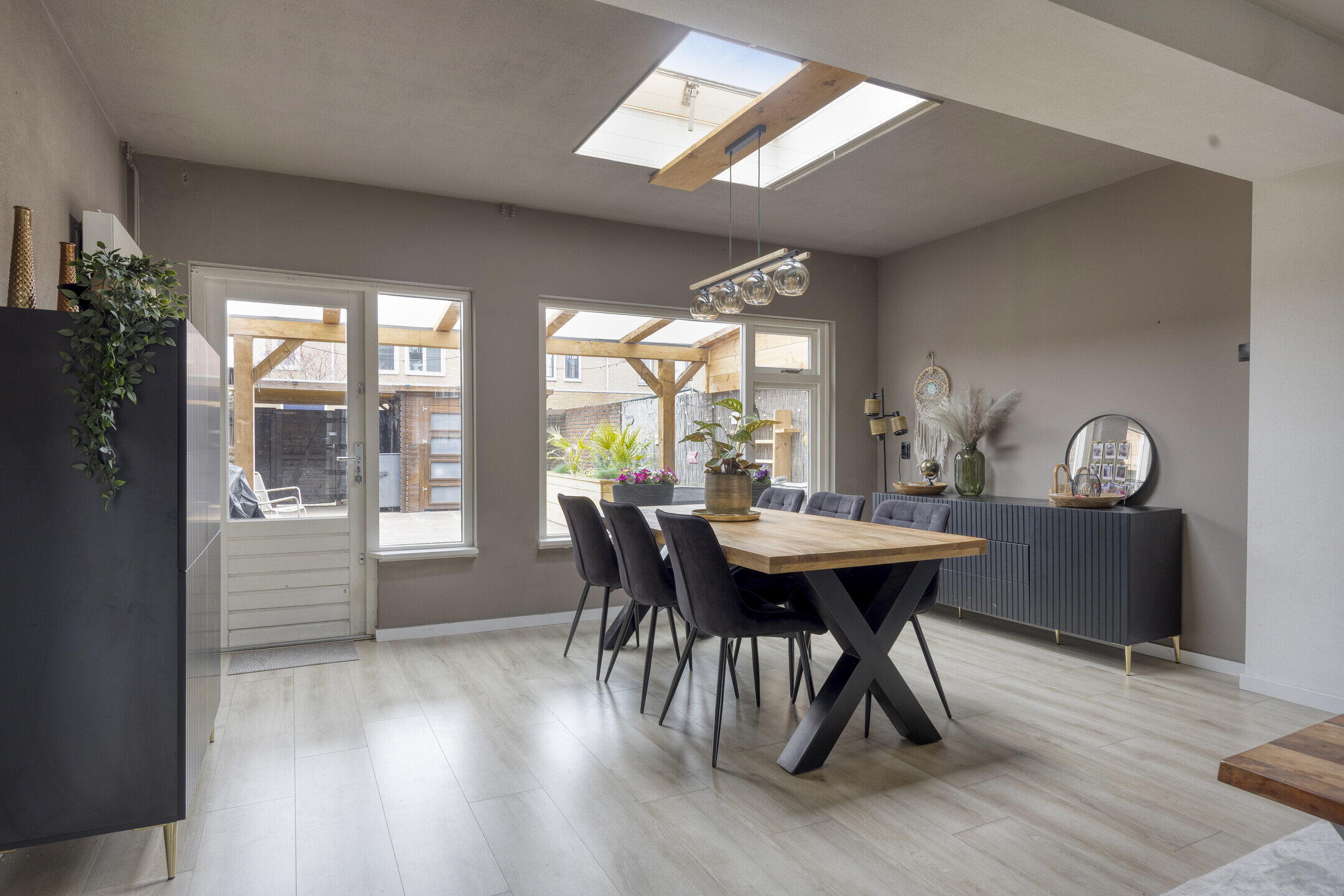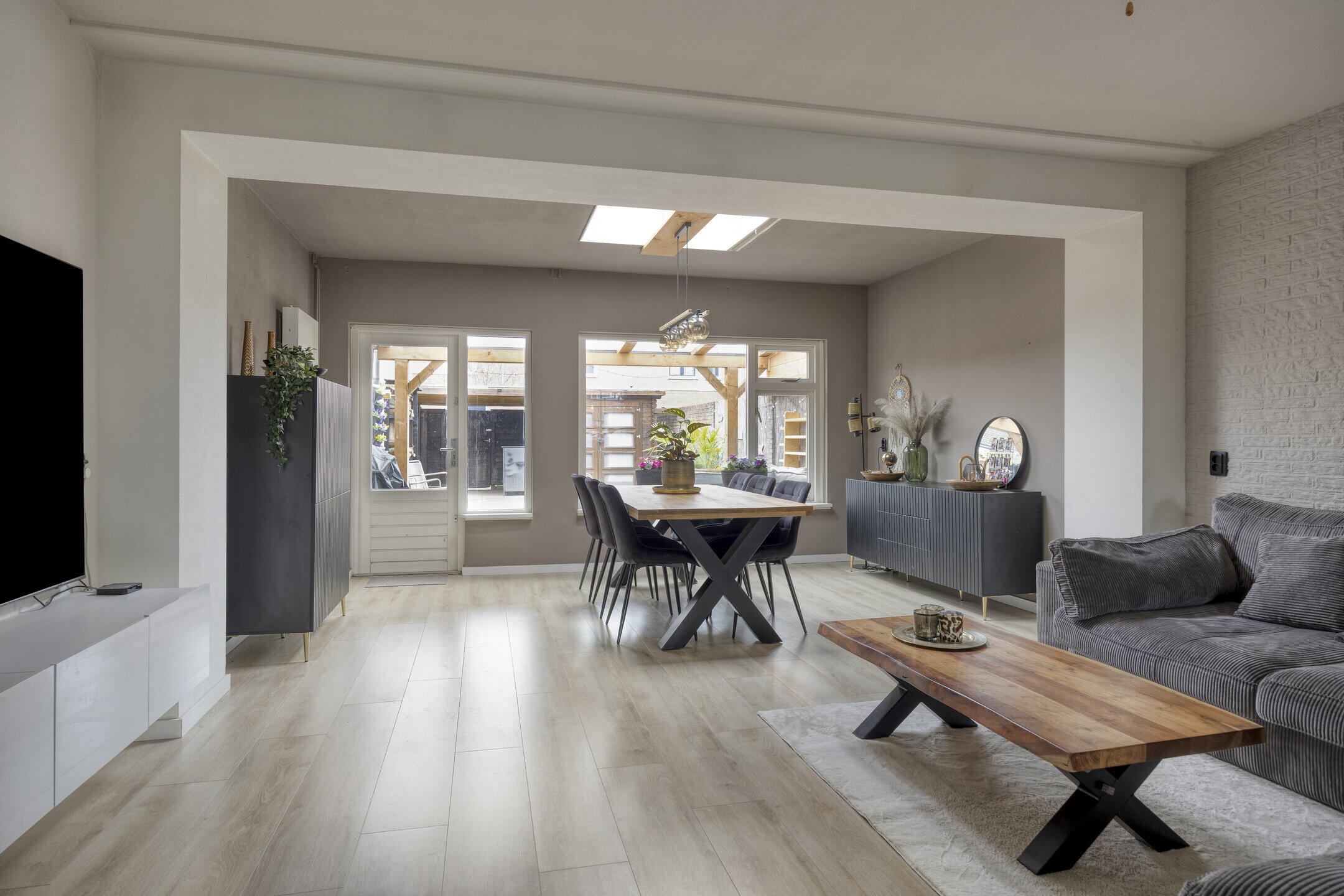 De woonkamer is ruim opgezet en voelt direct prettig aan dankzij de fijne indeling en de grote hoeveelheid lichtinval. De gezellige houtkachel vormt het warme hart van de ruimte, perfect voor knusse avonden. De eetkamer sluit hier naadloos op aan en biedt meer dan genoeg plek voor een royale eettafel waar je heerlijk kunt tafelen met familie en vrienden. De lichtstraat boven de eethoek zorgt voor een extra ruimtelijk en licht gevoel. De moderne keuken is strak uitgevoerd in wit met een donker werkblad en beschikt over veel lichtinval. De gezellige koffiehoek maakt het geheel helemaal af, een plek waar je de dag goed begint!